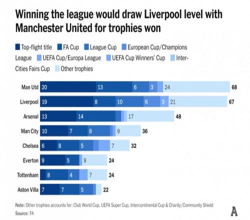 按利物浦标准,此次英超折桂将是第52座重要奖杯,他们将在奖杯数方面以52比47领先曼联。在最关键的两项赛事中,双方英格兰顶级联赛冠军数将持平(20比20),欧冠奖杯数方面利物浦6比3领先。曼联的优势仅存于足总杯冠军(13比8)与已停办的优胜者杯冠军(1比0)。